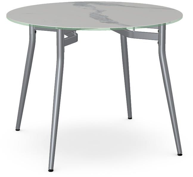 Italian porcelain on glass tabletop with a Statuario marble finish and 39" diameter.