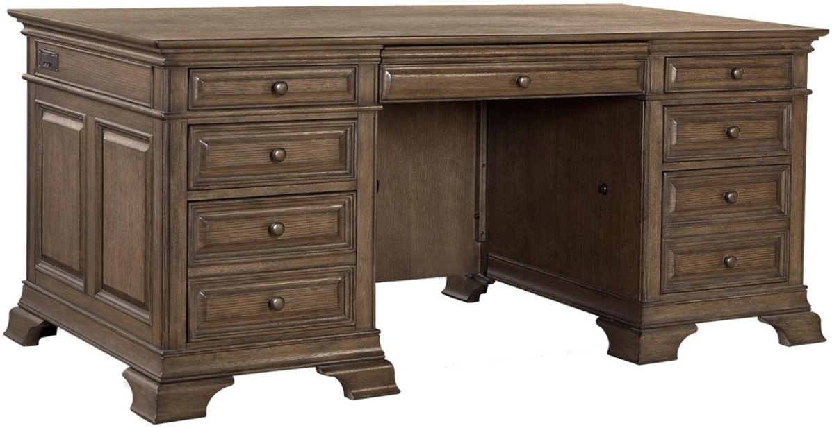 The aspenhome® Arcadia Truffle 72" Executive Desk offers a spacious work surface with ample storage, including multiple drawers for organization. It features a durable construction, providing practical functionality for both office and home settings.Read More