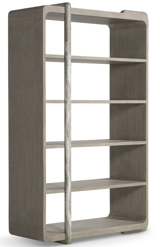 Wrapped shapes and a textural style give the Arcadia etagere a standout design in oak and faux stone. A rounded wood brace in Clay finish curves over one side of the case, while a faux stone post in Kalta encircles the front and back.Read More