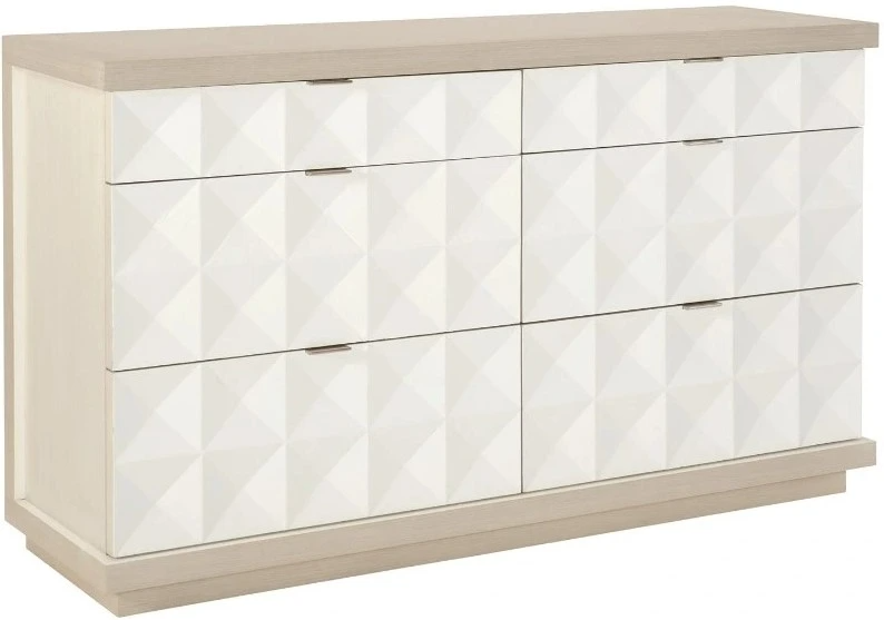 The Axiom dresser is a refined blend of linear and triangular designs with a clean, contemporary look. Expertly crafted with poplar solids and engineered faux anigre veneers, the dresser features cast shaped overlays with a 3-d motif of an inverted pyramid. The dynamic pattern adds depth and originality to this glamorous transitional piece.Read More