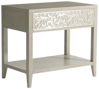 The cast metal drawer front of the Cornelia nightstand features a raised acanthus leaf pattern inspired by Florentine metalwork. Elegant tapered legs and a lower shelf are finished in Nebbia. The design also includes two-port USB charging unit.Read More