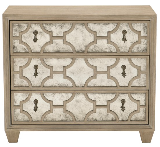 Three drawers with antiqued mirrored glass drawer fronts with patterned cast grille overlays
