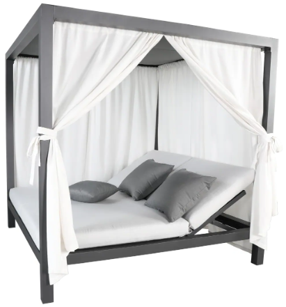 The New for 2023 Muse outdoor cabana daybed features a durable aluminum frame in 2 frame finish selections and many options for a bespoke, lounge-worthy outdoor refuge. Can be mounted to floor. Your muse: the pursuit of rest and relaxation.