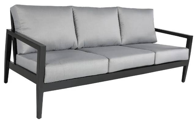 Crafted with distinct, angular back legs and a pitched back for superb comfort, Studio is available in dining, deep seating, and sectional frame options. Group photo shows cushions in 1046-93 Charcoal Sand and 21″ x 13″ pillows in Smolder Noir. Shade SOL Rope™ constructed from 32000-0036 Shade fabric.