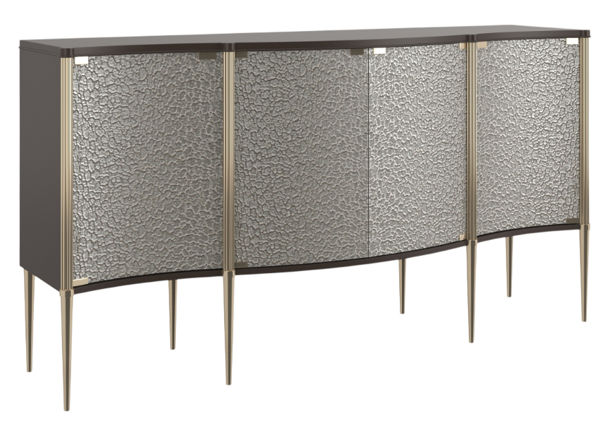 Serpentine in shape, it boasts an intriguing mix of materials and features extraordinary curved glass doors crafted with a textured pattern on the inside. Metal posts and hardware finished in zinc add contrast to its seal skin and whisper of gold exterior.