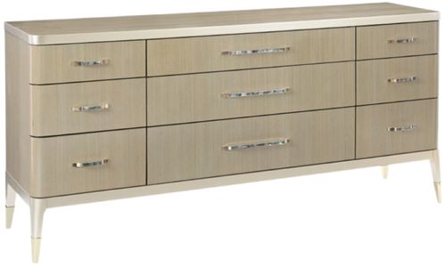 Abundantly graceful, this nine-drawer dresser will elevate the design quotient of any space. Its balanced silhouette is distinguished by koto panels in champagne shimmer and highlighted with taupe paint inside and out. Look in the top left drawer and find an ultra-functional jewelry tray that makes it easy to find favorites.Read More