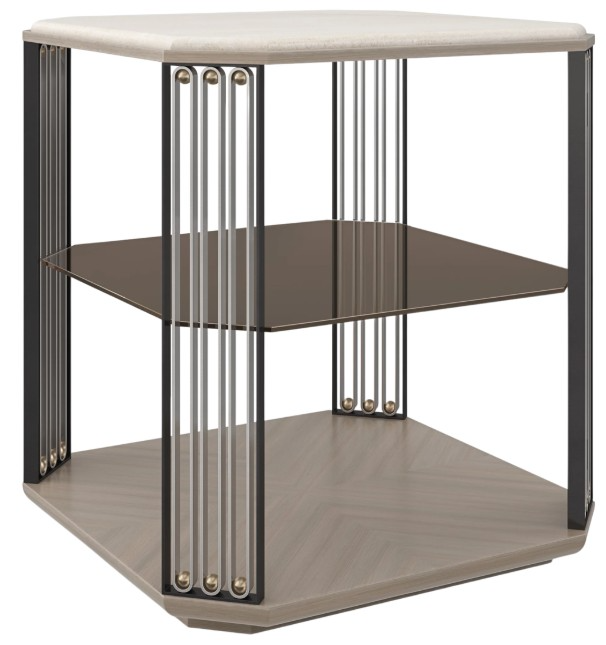 A seemingly floating glass shelf in a smoky bronze finish adds to the allure of this end table, inspired by the bent metal work of notable French designer Royère. Features ornamental legs, meticulously crafted in a fusion of Deep Bronze, Brushed Gold, and Brushed Stainless metals, topped by Crème Travertine stone.Read More