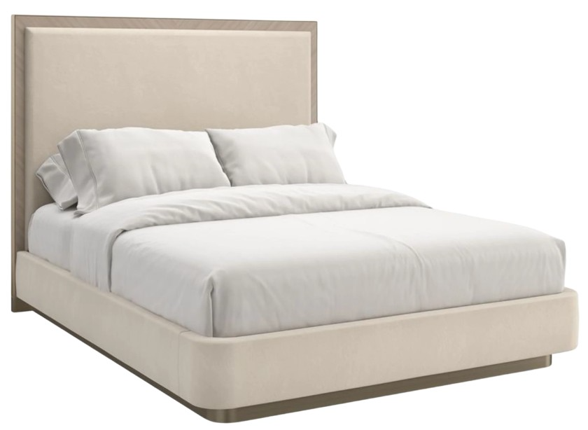 Seemingly floating on a brushed gold plinth base, its sophisticated silhouette brings effortless elegance to bedroom interiors and guest suites. Also available with paneled, chevron-patterned headboard wings for added drama.