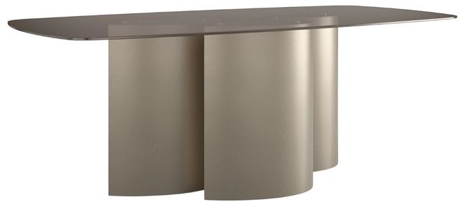 Gathered columns with a sharply angled, teardrop shape lend a sculptural element and sense of movement to this glass top dining table. Its uniquely designed base appears to emulate a school of darting fish, and from the side, it quickly guides the eye, for a look that shimmers and is visually light.Read More
