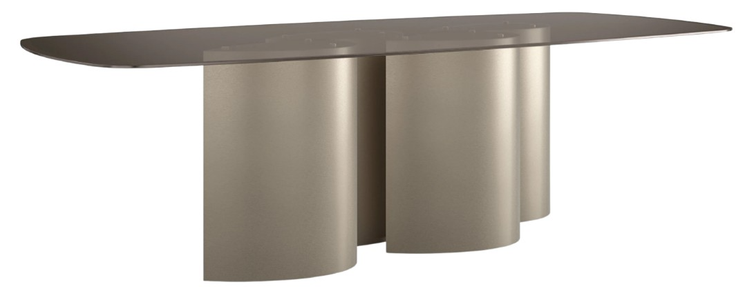 Gathered columns with a sharply angled, teardrop shape lend a sculptural element and sense of movement to this glass top dining table. Its uniquely designed base appears to emulate a school of darting fish, and from the side, it quickly guides the eye, for a look that shimmers and is visually light.Read More