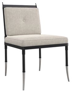 Accentuated by scrollwork along the back in a warm brushed gold finish. Tall, slender legs capped in brushed stainless metal ferrules lend a distinctive finishing touch. Style as a dining chair or mix in conversation spaces for an effortlessly elegant extra seat.
