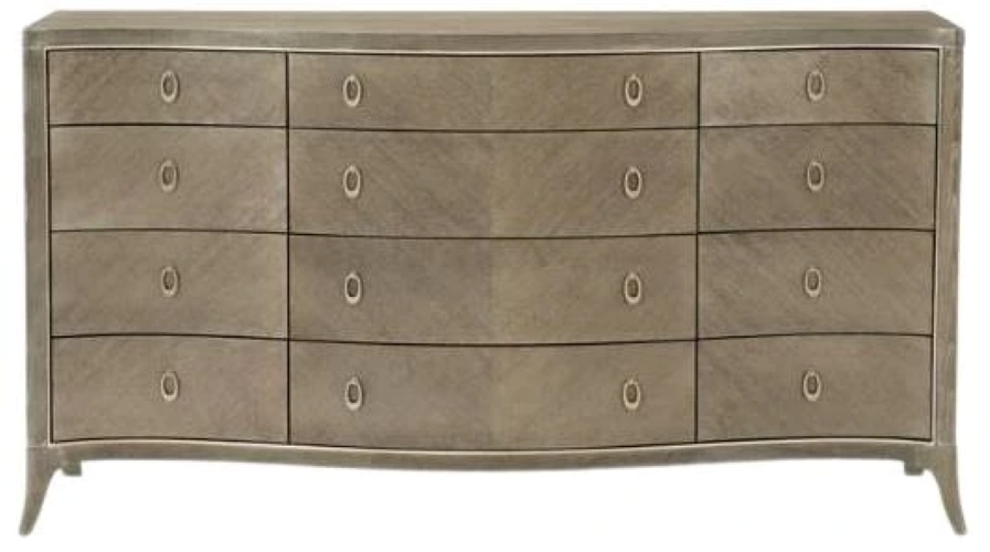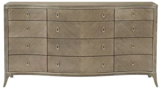 This generous dresser stands out with its lyrical serpentine shape. The grain of quartered ash veneer is arranged in a chevron pattern and brought to life with an elegant linen finish. Custom contemporary oval metal pulls add the perfect punctuation to the 12 self-closing drawers that are finished in pearl.Read More