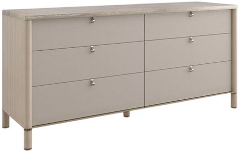 Light tones and organic textures in perfect balance exude a refined modern elegance. Soft-to-touch, vinyl wrapped drawers are complemented by Silver Platano wood veneers and a polished travertine stone top. Metal accents and a base in Lucent Bronze add warmth and subtle contrast to its calming, clean-lined form.Read More