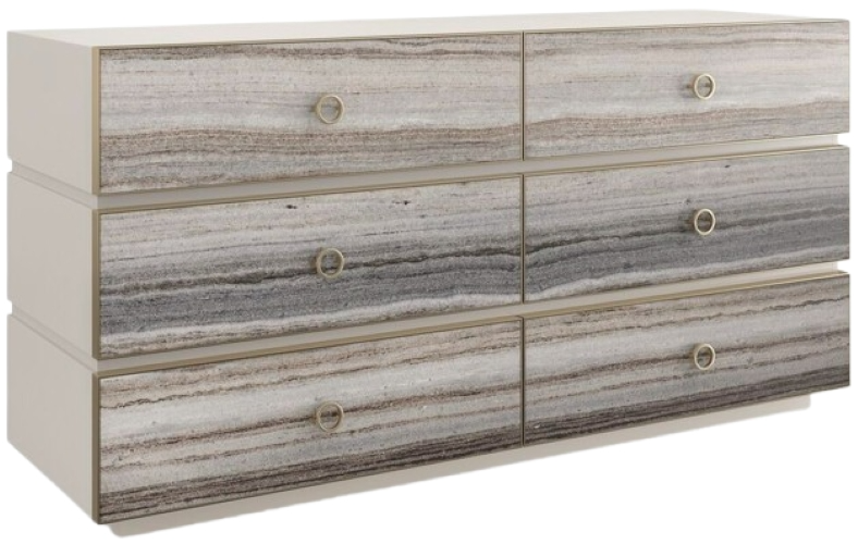 A compelling mix of texture and material, the Bedrock Dresser brings an organic elegance to bedroom interiors. Crafted from polished gray sandstone with intricate banding and natural color variations, drawer fronts are minimally adorned with metal trim and small ring pulls in Champagne Gold.Read More