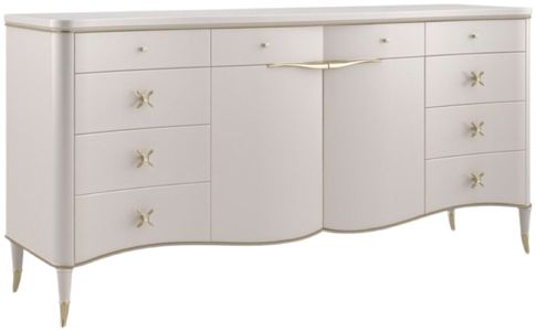 This dresser features nine drawers and adjustable shelves behind two center doors, with ample space for neatly keeping clothes and jewelry. Surprise moments: a top center drawer adorned with a silkscreen pattern, and two outer drawers lined in our classic Caracole Crème felt. Splayed legs dressed in gold metal ferrules and ornate drawer pulls with a ceramic inset add to its splendor.