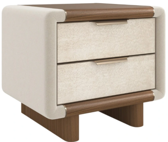 This nightstand is the ultimate mixed-media story. This eclectic square piece is softened with bullnose edges around. The top, base and rounded plank legs are dark retro walnut. The fronts of the two, generous drawers showcase the tiny, swirling eyes of birdseye maple with a light, smoked finish. Stone-colored micro-suede dresses each end of the chest.Read More