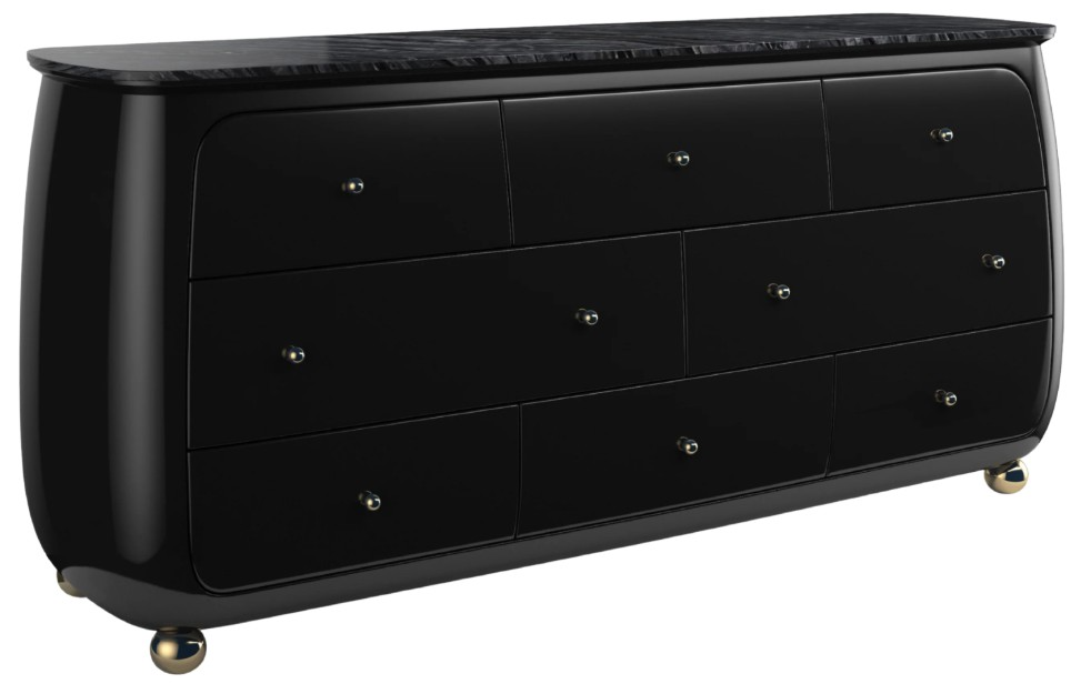 Eight soft-close drawers are curved to accentuate the sensuous nature of the piece. The final touches of whisper of gold spherical knobs and metal ball feet make this a piece to collect.