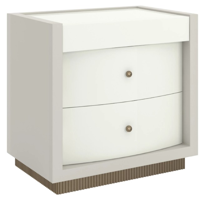 Adding Calais Nightstands to a room with a Calais Dresser will enhance your vision for a room with modern French sensibilities. The outer square case is finished in Rockport Grey Adobe with a top in Almond Milk. Set back in the outer case are two bow-front drawers in Almond Milk.Read More