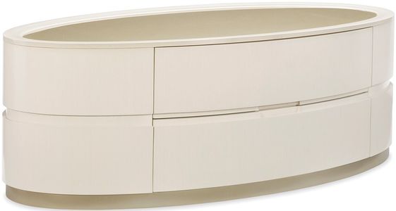 The Adela Oval Cocktail Table has modern neoclassic features and is beautifully detailed with a beveled glass top that reflects shimmering Blush Taupe paint underneath. The piece has two drawers; the top drawer’s interior has Blush Taupe metallic stencil details.Read More