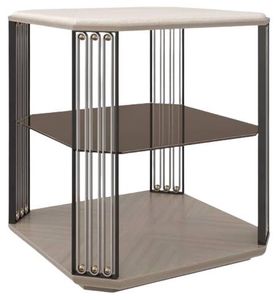 A seemingly floating glass shelf in a smoky bronze finish adds to the allure of this end table, inspired by the bent metal work of notable French designer Jean Prouvé.Read More