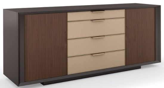 A masterful mix of form and function, this mid-century-inspired console stirs interest with its linear design and host of storage options. Sliding tambour doors in rich walnut add texture and contrast to a dark chocolate finish.Read More