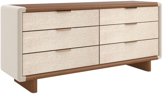 Postmodern design is displayed in this sophisticated dresser that exudes a creative mix of materials. This eclectic, rectangular piece is softened with bullnose edges. The top, base, and rounded plank legs are dark, new natural walnut. The fronts of the six, generous drawers showcase the tiny, swirling eyes of birdseye maple with a light, smoked finish.Read More