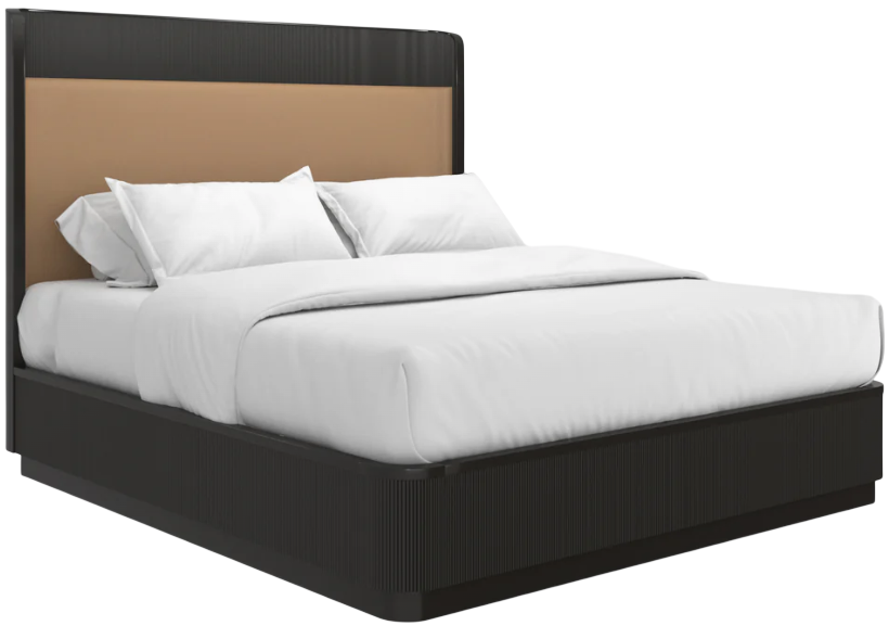 “Fall in Love” is even more captivating with this beguiling interpretation of our softly curved platform bed. A thoughtful combination of luxe materials, reeded the headboard, footboard, side rails and plinth base are sultry Dark Chocolate. The headboard is upholstered with an inset of rich Camel pebbled leather.Read More