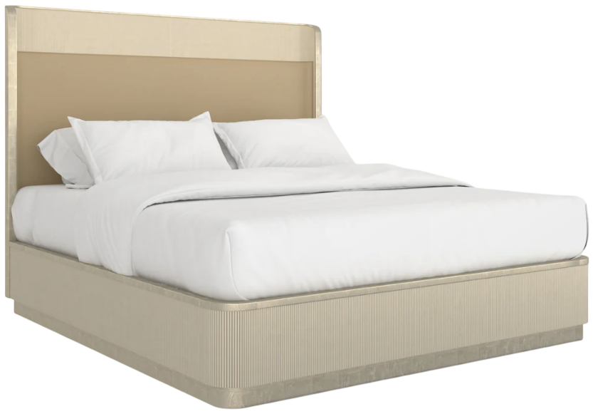 For a beguiling interpretation of our softly curved platform bed, “Fall in Love” combines a thoughtful mix of luxe materials. The reeded headboard, footboard, side rails and plinth base are shimmering oracle. The headboard is upholstered with an inset of sumptuous material that has the look of champagne silk.Read More