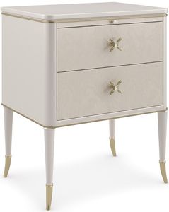 A shining example of attention to detail and materials, this nightstand offers elegant bedside storage with a hint of glitz. Encased in a shimmering Stardust finish, it features drawer fronts in a silver-dyed Madrona burl with cloud-like swirls, warmly complemented by soft gold tones and striped beading in a Platinum finish.Read More