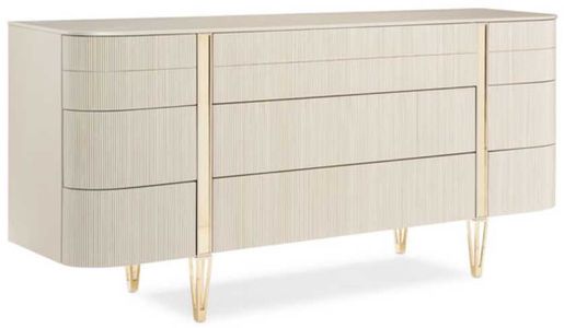 The gracefully rounded profile of its fashion-forward design adds visual appeal to any space and is accentuated with exquisite fluted drawer fronts, metal band detailing, designer legs, and a sophisticated finish palette of Whisper of Gold and Matte Pearl.