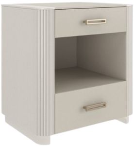 Cap the sides of your favorite bed with elegant nightstands that are just as dreamy. This 25-inch version boasts a fashion-forward design with a softly rounded profile accentuated by Matte Pearl paint, exquisite fluted sides and vinyl wrapped drawer fronts. Lustrous from every angle, it features a sophisticated palette of finishes.Read More
