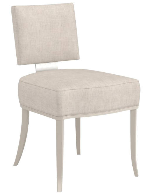 This contemporary side chair takes on dramatic style when you view the wide, Lightly Brushed Chrome panel that shines off its back. Neutral fabric fully surrounds the square upper back and seat cushion that rest on an exposed wood frame, sabre legs and gracefully curving arms finished in Matte Pearl.Read More