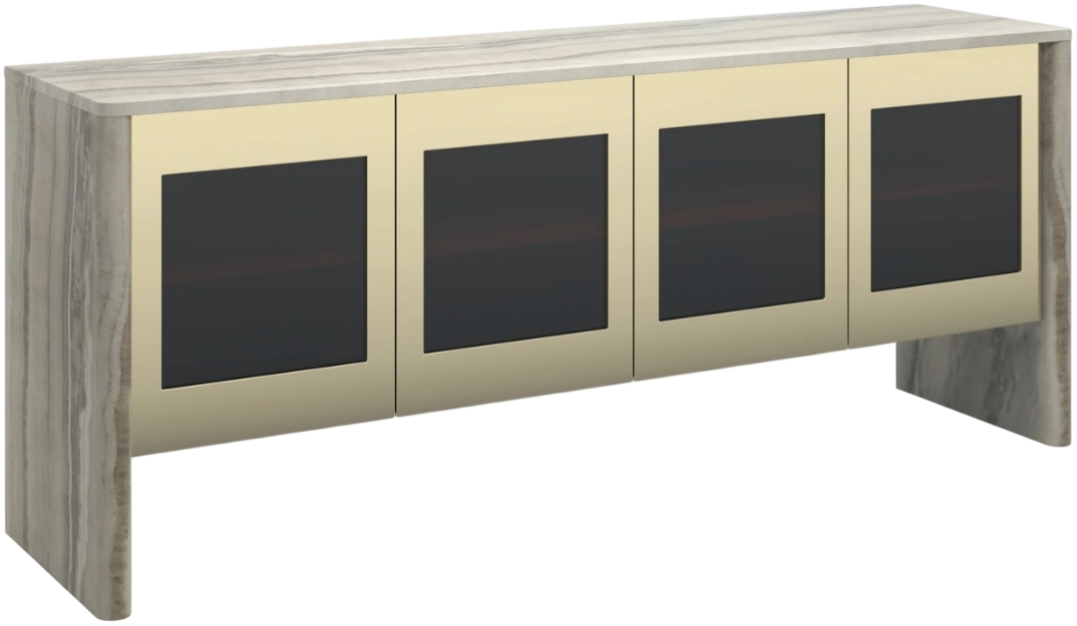 Sojourn gives off a 70s retro vibe with its “big look.” Immediately, your eyes are drawn to the large slabs of gray onyx marble that create the legs and top of the sideboard. Inset into the stone frame are four metal doors that create Whisper of Gold frames for the inset bronze glass front panels.Read More