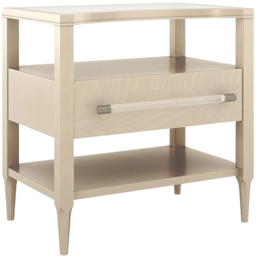 Offers open storage above and beneath a single, soft-close drawer, finished in Natural Glow to highlight the exquisite wood grain. A clear acrylic pull rod capped in Satin Nickel finishes the look with an element of distinction.