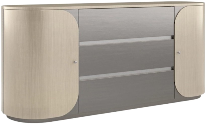 With clean lines and curves beautifully balanced by a monochromatic palette, this oval-shaped dresser introduces a sleek, Italian modern aesthetic to bedroom interiors. Smoked stainless steel painted drawers lend subtle contrast to rounded doors in a thunder-finished veneer that punctuates the wood grain.Read More