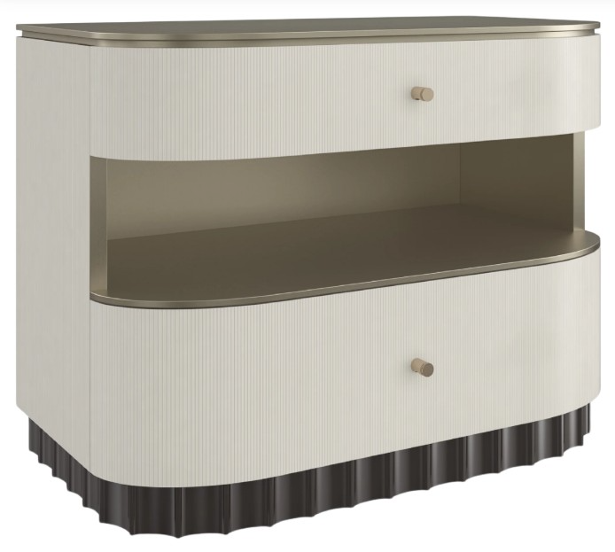 Designed with the utmost attention to detail, this bedside table celebrates the timeless beauty of neoclassical architecture. Features two drawers with soft corners and vertical micro fluting in Ivory paint, separated by open space for bedside storage and display. A Brushed Whisper of Gold on top adds warmth and a note of luxe.Read More