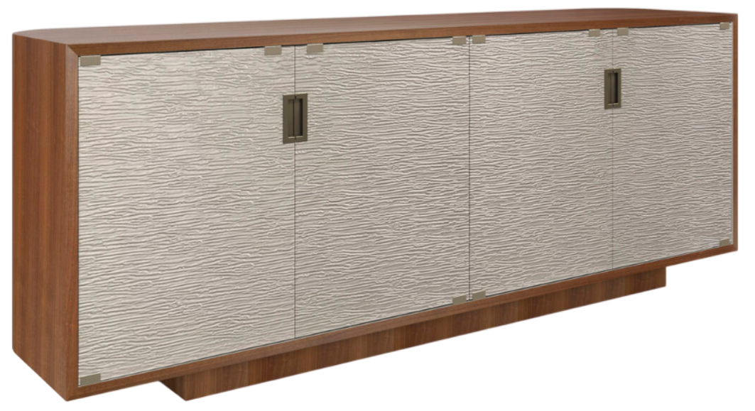 Rippling waves of textured glass float along the front of this rich retro walnut cabinet that mixes materials and shapes with ease. The cabinet has a strong rectangular presence that is softened by rounded chamfers on the back corners. The front four doors are hand-leafed in oracle, enhancing the shimmer of the cabinet.Read More