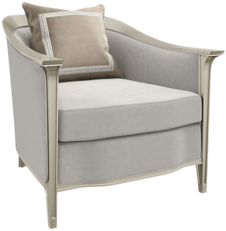 Warmly enveloping, this chair eloquently mixes classic details with graceful curves. A carved wood frame in afterglow paint guides the eye and accentuates its refined silhouette. Dressed in a luxuriously soft slate fabric, accented by a contrasting toss pillow artfully framed with windowpane tape trim.Read More