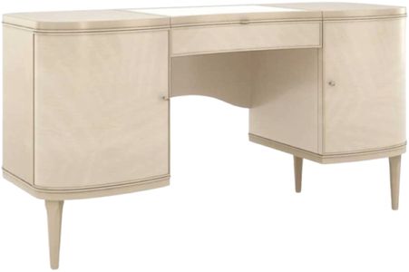 Encased in Champagne Pearl, it features doors on either side, each with a top drawer and pull-out bottom shelf with dividers for organized storage. Easily converts from an elegant writing desk to a dressing table with a flip-top mirror that conceals a removable jewelry tray and vinyl interior.