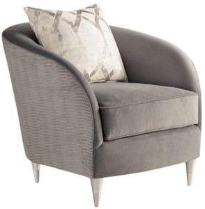 Soft curves converge with flowing lines to create an enveloping silhouette. Features a plush seat and smooth upholstered back, dramatically defined by pleated velvet that wraps the frame with a rippling effect. A metallic pillow adds an artful accent, complemented by tapered round legs with polished ferrules.Read More