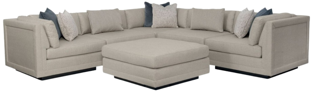 All pieces are perfectly sized and deeply comfortable, tailored to perfection in a neutral, menswear-inspired look with a textured tweed pattern that’s touchably soft. Contrasting accent pillows add additional style, fashioned in a deep gunmetal grey in both velvet and fine corduroy-like styles, as well as a contemporary styled black and white herringbone stitch. A cut-out boxing design around the outside back and a recessed wood plinth base in simply black complete the sectional's distinctive aesthetic style.