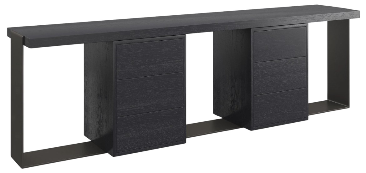 Sleek and sophisticated, this modern console makes a bold statement in spaces designed for entertaining. A clever use of negative space creates depth and dimension, punctuated by metal frame and beautifully grained veneers in a matte black finish. Features open space for creative display and storage, and six soft-close drawers for staying organized.Read More