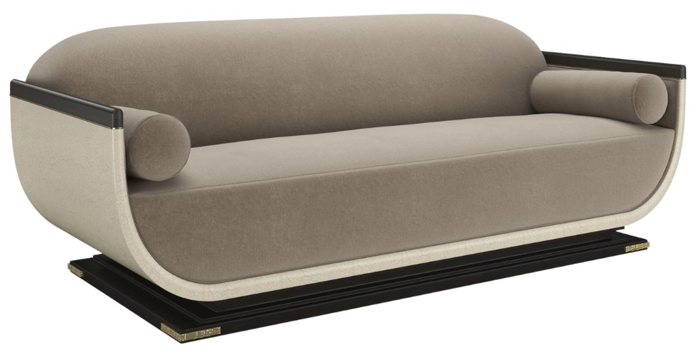 A modern interpretation of classic Roman shapes, this sofa is remarkable for its length and deep-scooped wood frame with an Ivory Craze crackled finish that is trimmed with Brushed Gold paint. The frame is perched on a wood-tiered base in Charred Bark with Brushed Gold metal corner appliques.Read More