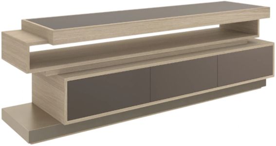 Enhancing the “La Moda” suit of pieces, La Moda Media Console is distinguished by the architectural offset stacking of mixed materials. The top frame showcases Koto veneer wood finished in dry martini and inset with smoked bronze mirrored glass. The table tiers are Koto in dry martini with a neutral metallic finish.Read More