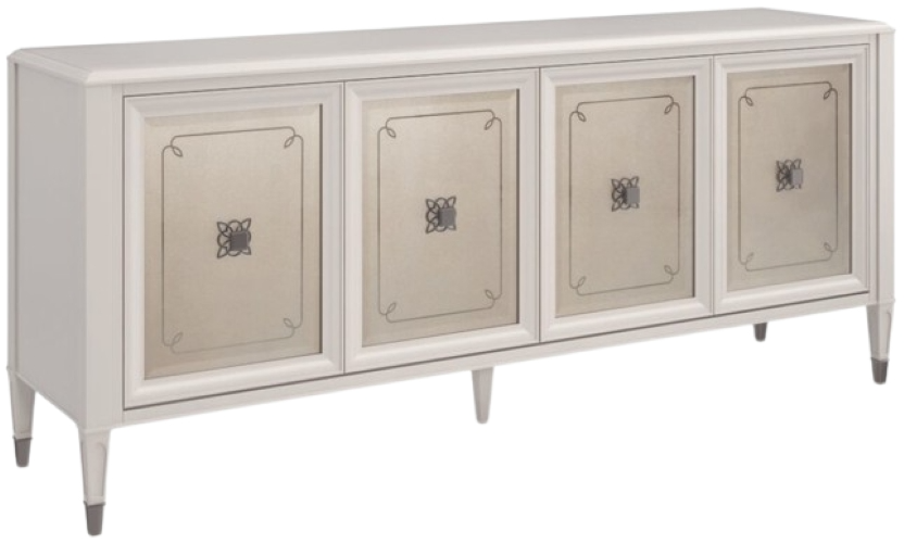 h its exquisite detailing and shimmering Stardust finish, this buffet effortlessly mixes beauty and functionality. Classic styling features mirrored door fronts with a decorative element stenciled on the back in Soft Silver paint, complemented by a quatrefoil pattern behind its custom hardware for added interest and dimension.Read More