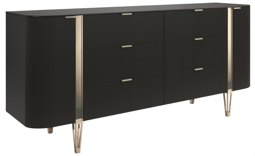 Dark and stately, love at first sight offers more storage at 78 inches long. It takes on a sultry demeanor in dark chocolate that accentuates the exquisite reeding on the drawer fronts with whisper of gold metal band detailing and designer legs.Read More