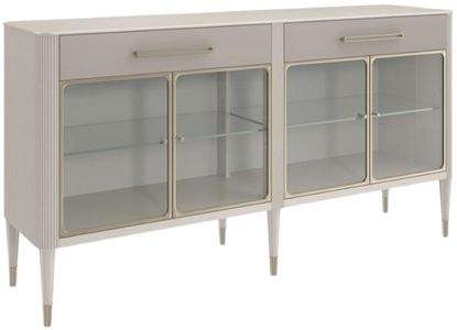This streamlined cabinet introduces a modern-yet-elegant silhouette, crafted in Birch wood with reeded details and a Matte Pearl finish. Vinyl-wrapped door fronts with linear hardware lend a contemporary element, complemented by glass doors framed in a Whisper of Gold. Its lit interior offers generous storage with adjustable glass shelves and a touch dimmer switch.Read More