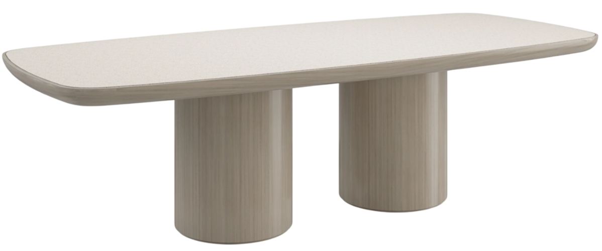 Balancing the beauty of stone with light wood tones, this modern dining table draws the eye with its elongated, soft-cornered shape. Features a silica terrazzo top with the aesthetic of crushed stone, atop two rounded pedestals in a sand-colored finish that naturally showcases the linear grains of Japanese sen.Read More