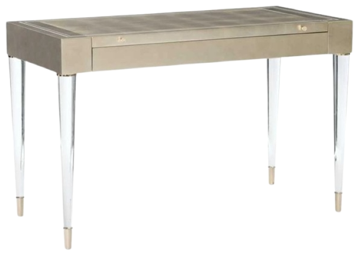 Upon opening, you’ll find a mirror mounted to the inside and a front apron that drops down to create a flat work surface. Tapered round acrylic legs offer a finishing touch and are capped with metal ferrules in plated whisper of gold. Thoughtfully scaled to fit urban spaces, it’s the quintessential vanity for the modern woman.