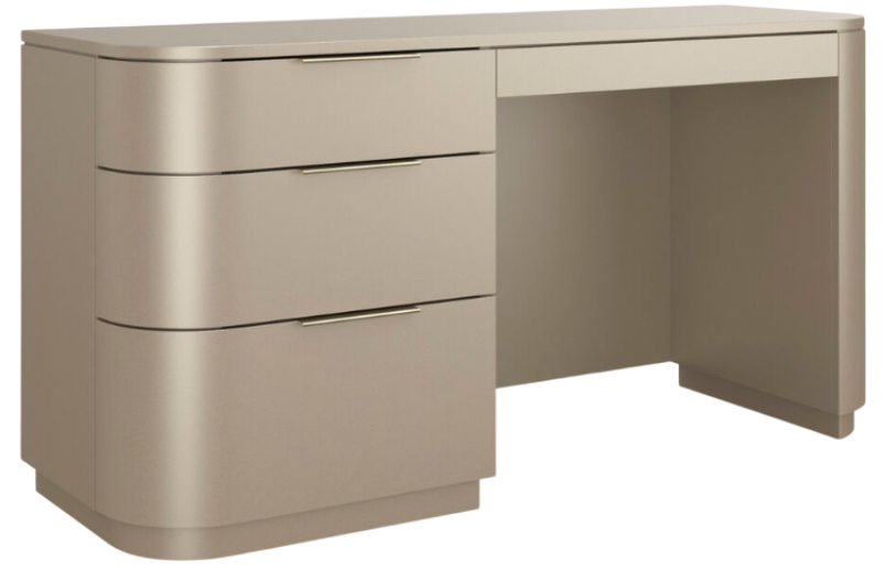 At once retro and contemporary, the strong vertical lines of this desk are softened with an oversized fillet on each end of the cabinet. The seamless, full-surround exterior and interior finish is glowing soft silver gloss paint. This piece showcases discrete brushed whisper of gold metal pulls, stamped with the caracole logo.Read More